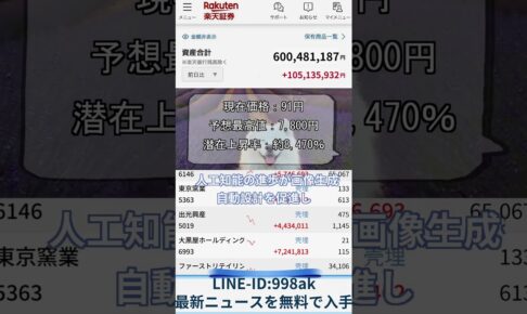 株式投資動画で触れた銘柄について、 もう少し詳しく知りたい方は、 LINE🆔【c11270】を検索して追加してください。 追加後に「123」と送っていただければ、 無料でレポートをお送りします。 ※ ご案内できる…