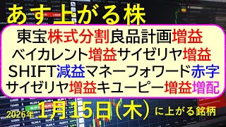 東宝株式分割。良品計画増益。ベイカレント増益。サイゼリヤ増益。SHIFT減益。マネーフォワード赤字。サイゼリヤ増益。キユーピー増益増配。