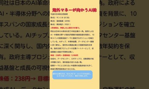 海外株式投資今週の日本株注目銘柄と 2月相場で注目する本命。 同社は 日本のAI革命を担う中核企業の一角。 政府によるAI・半導体分野への 継続的な国家投資を背景に、 10年スパンの成長テーマに直結。 AIチップ、半導体装置、 デー…